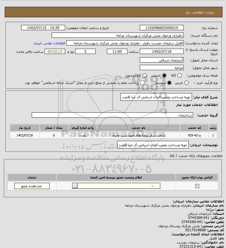 استعلام بها و موضوع استعلام استعلام تهیه وساخت ونصب المان اسامی آل عبا 6عدد به اطلاع کلیه شرکتها و افراد متخصص واجد شرایط میرساند، آگهی گذار در نظر دارد از طریق استعلام بها، نسبت به انتخاب و دریافت پیشنهادات اقدام نماید. این استعلام با کد آگهی ثبت شده در سامانه خبرگزاری پارس نماد : 6428084 منتشر شده است. مشخصات استعلام : تاریخ شروع استعلام: 1402/07/15 آخرین مهلت ارسال پیشنهاد قیمت : 1402/07/18 و محل اجرای پروژه : استان مناقصات استان آذربایجان شرقی میباشد. استعلام قیمت مورد درخواست : استعلام تهیه وساخت ونصب المان اسامی آل عبا 6عدد با دستهبندیهای تخصصی و گروه های مرتبط : تجهیزات پارک و مبلمان شهری, ساختمان, استعلام اطلاع رسانی میگردد.
