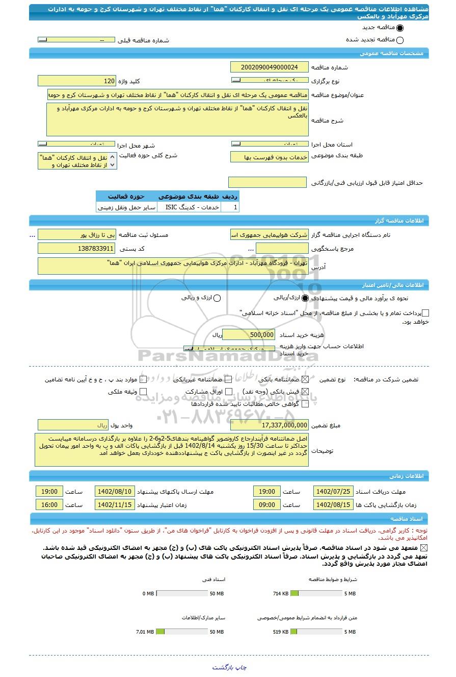 | شرح مناقصه | نقل و انتقال کارکنان "هما" از نقاط مختلف تهران و شهرستان کرج و حومه به ادارات مرکزی مهرآباد و بالعکس | ||||||||
