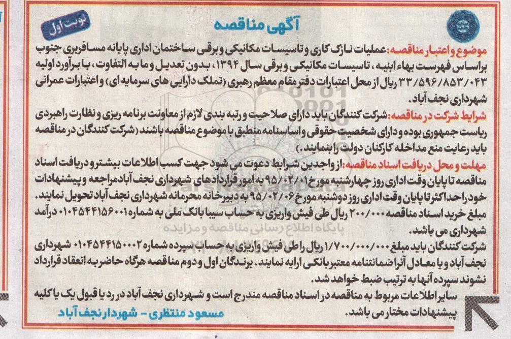 موضوع و اعتبار مناقصه: عملیات نازک کاری و تاسیسات مکانیکی و برقی ساختمان اداری پایانه مسافربری جنوب براساس فهرست بهاء ابنیه، تاسیسات مکانیکی و برقی سال 1394، بدون تعدیل و مابه التفاوت، با برآورد اولیه 33.596.853.043 ریال از محل اعتبارات دفتر مقام معظم رهبری (تملک دارایی های سرمایه ای) و اعتبارات عمرانی شهرداری نجف آباد