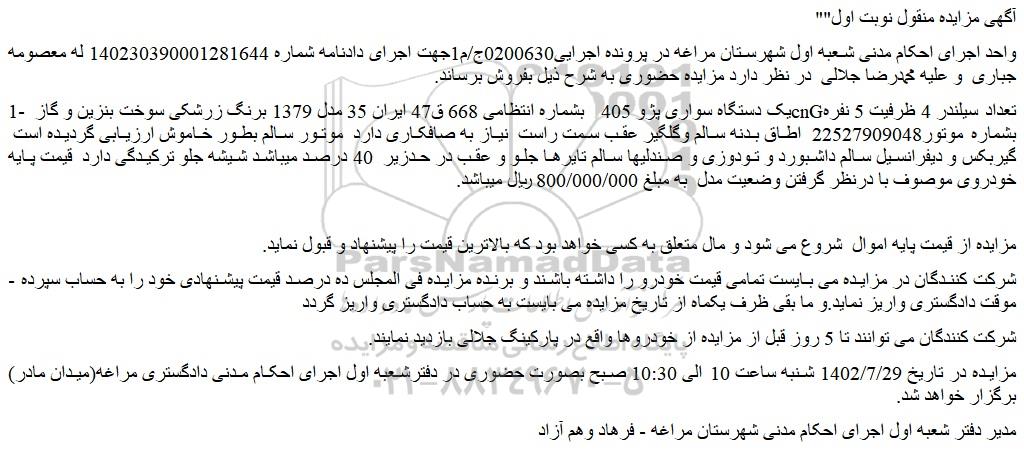 مزایده در تاریخ 1402/7/29 شنبه ساعت 10 الی 10:30 صبح بصورت حضوری در دفترشعبه اول اجرای احکام مدنی دادگستری مراغه(میدان مادر) برگزار خواهد شد.
