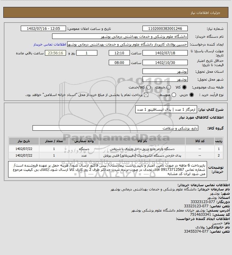 توضیحات خریدار:بازپرداخت 6 ماهه در صورت تامین اعتبار و تایید ریاست بیمارستان/ پیش فاکتور ارسال شود/ هزینه حمل بر عهده فروشنده است/ شماره تماس 09173712567 آقای نجدی در صورت برنده شدن حداکثر ظرف 2 روز کاری کالا ارسال شود./کالای بی کیفیت مرجوع می شود ایران کد مشابه