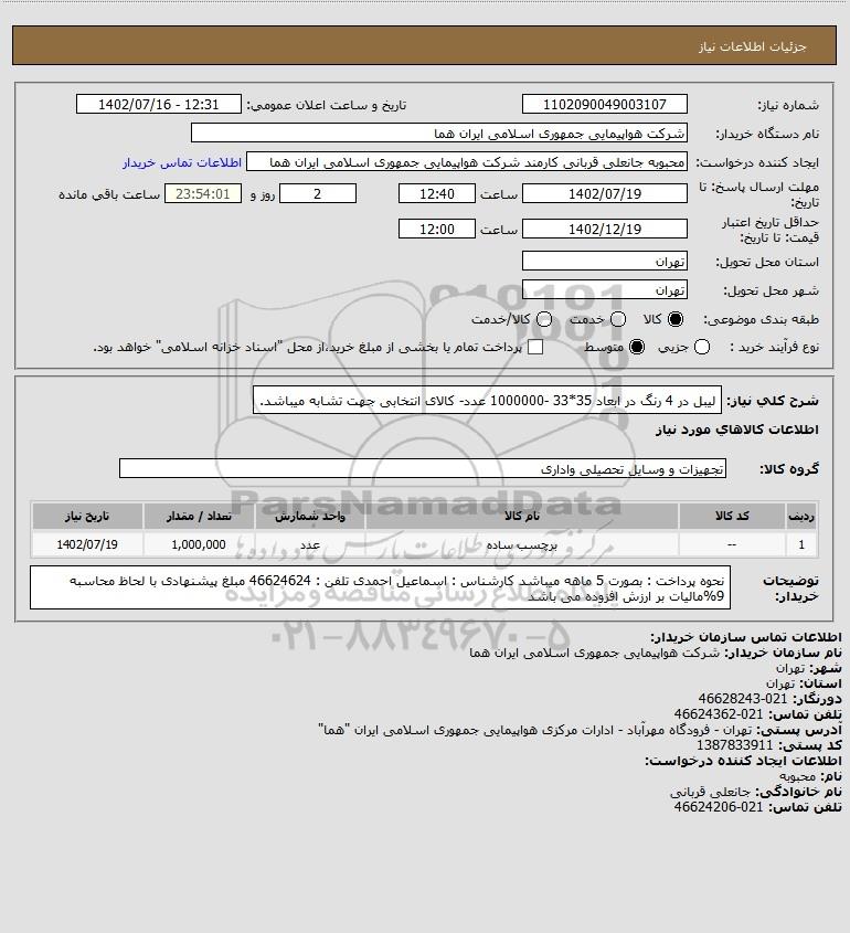 شرح کلی نیاز: لیبل در 4 رنگ در ابعاد 35*33 -1000000 عدد- کالای انتخابی جهت تشابه میباشد.