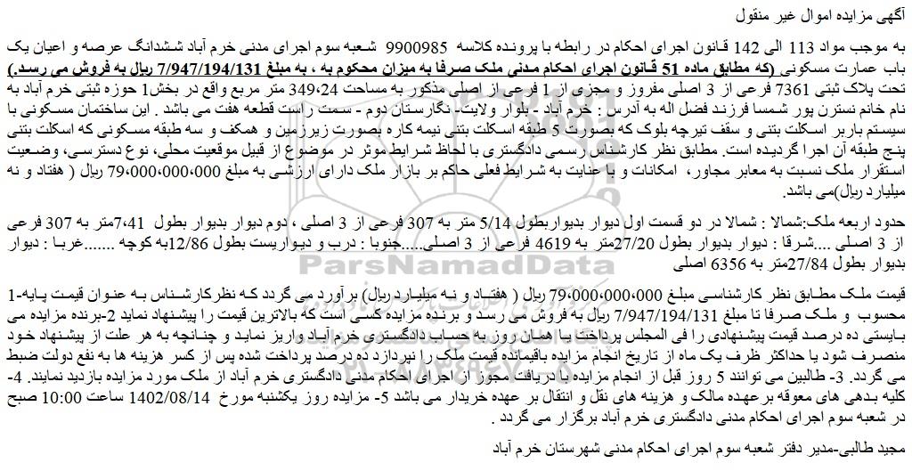 به موجب مواد 113 الی 142 قانون اجرای احکام در رابطه با پرونده کلاسه 9900985 شعبه سوم اجرای مدنی خرم آباد ششدانگ عرصه و اعیان یک باب عمارت مسکونی (که مطابق ماده 51 قانون اجرای احکام مدنی ملک صرفا به میزان محکوم به ، به مبلغ 7/947/194/131 ریال به فروش می رسد.) تحت پلاک ثبتی 7361 فرعی از 3 اصلی مفروز و مجزی از 1 فرعی از اصلی مذکور به مساحت 349،24 متر مربع واقع در بخش1 حوزه ثبتی خرم آباد به نام خانم نسترن پور شمسا فرزند فضل اله به آدرس : خرم آباد - بلوار ولایت- نگارستان دوم - سمت راست قطعه هفت می باشد . این ساختمان مسکونی با سیستم باربر اسکلت بتنی و سقف تیرچه بلوک که بصورت 5 طبقه اسکلت بتنی نیمه کاره بصورت زیرزمین و همکف و سه طبقه مسکونی که اسکلت بتنی پنج طبقه آن اجرا گردیده است. مطابق نظر کارشناس رسمی دادگستری با لحاظ شرایط موثر در موضوع از قبیل موقعیت محلی، نوع دسترسی، وضعیت استقرار ملک نسبت به معابر مجاور، امکانات و با عنایت به شرایط فعلی حاکم بر بازار ملک دارای ارزشی به مبلغ 79،000،000،000 ریال ( هفتاد و نه میلیارد ریال)می باشد.