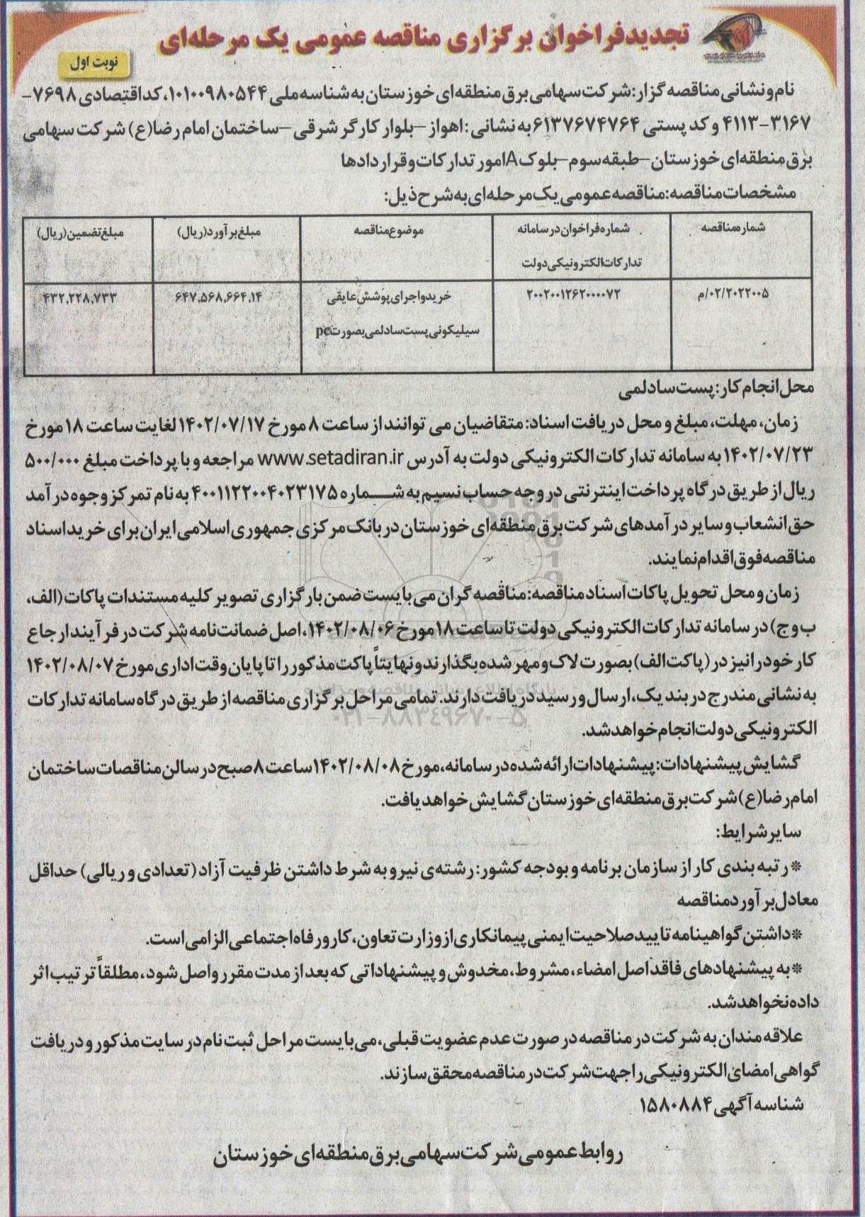 | 2022005/ 02/ م | 2002001262000072 | خرید و اجرای پوشش عایقی سیلیکونی پست سادلمی به صورت Pc | 647.568.664.14 | 432.228.733 |