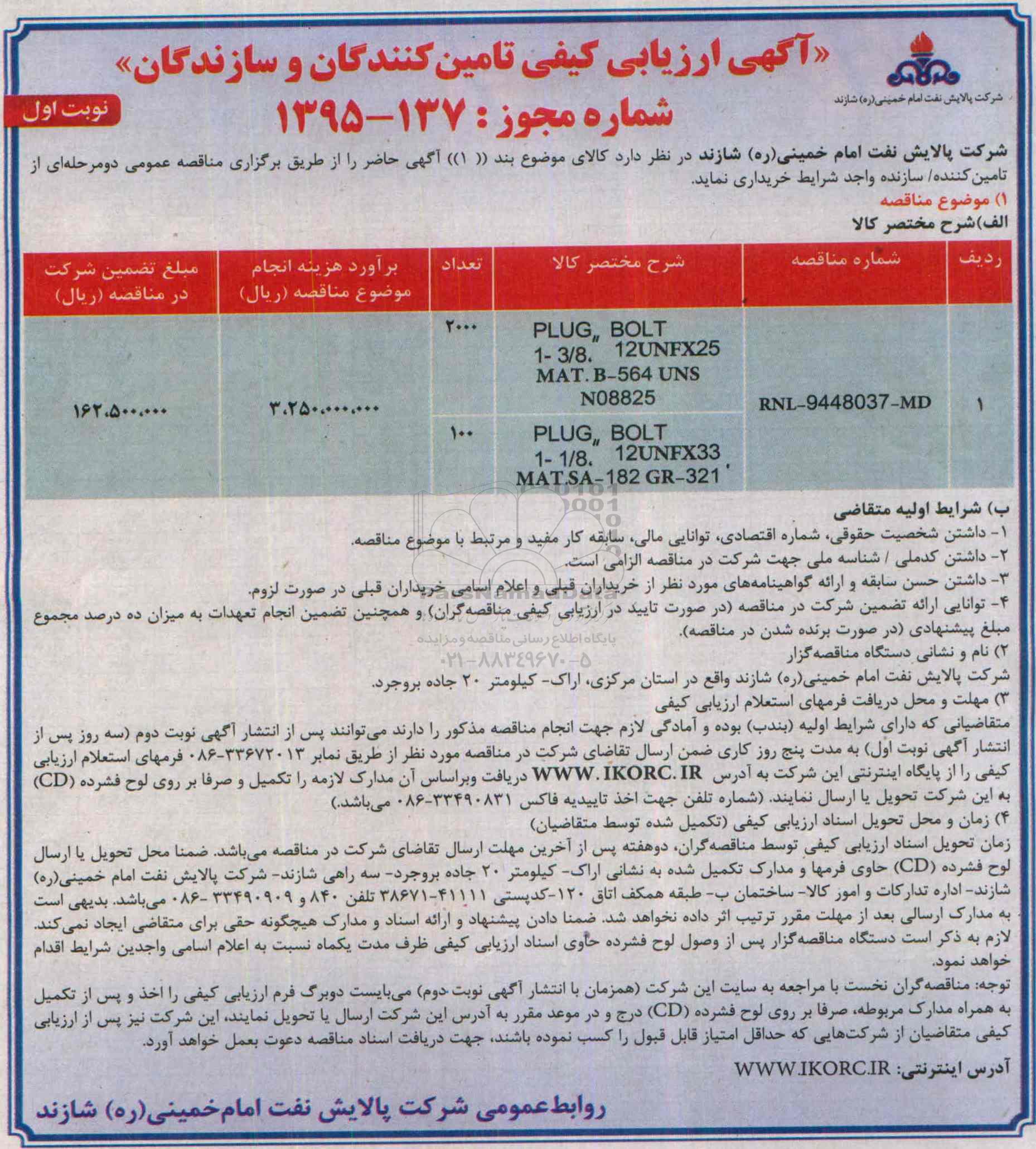 آگهی ارزیابی کیفی تامین کنندگان و سازندگان PLUG BOLT, آگهی ارزیابی کیفی ، آگهی ارزیابی کیفی PLUG BOLT
