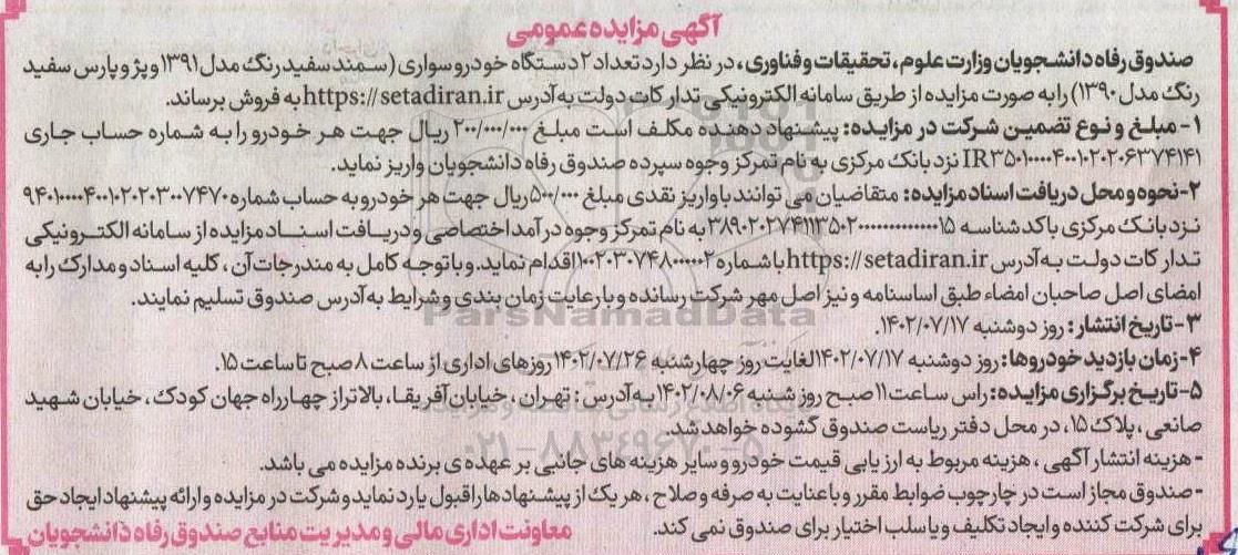 صندوق رفاه دانشجویان وزارت علوم، تحقیقات و فناوری در نظر دارد تعداد 2 دستگاه خودرو سواری (سمند سفید رنگ مدل 1391 و پژو پارس سفید رنگ مدل 1390) را به صورت مزایده از طریق سامانه الکترونیکی تدارکات دولت به آدرس ستاد ایران به فروش برساند.
