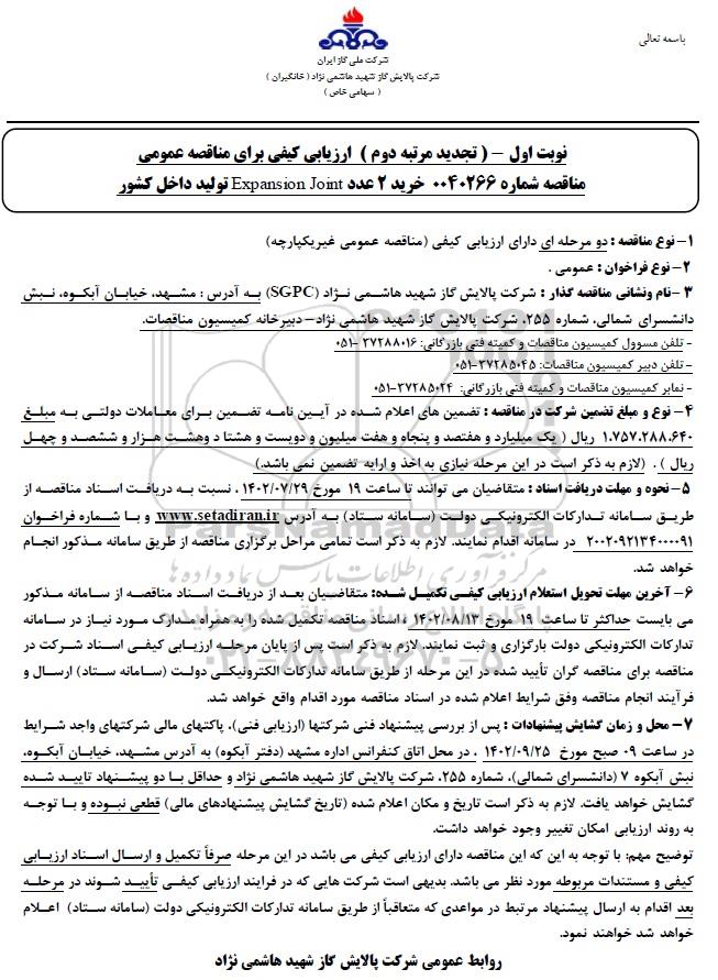 تجدید مرتبه دوم ارزیابی کیفی مناقصه خرید 2 عدد Expansion Joint , تجدید مرتبه دوم ارزیابی کیفی مناقصه خرید 2 عدد Expansion Joint
