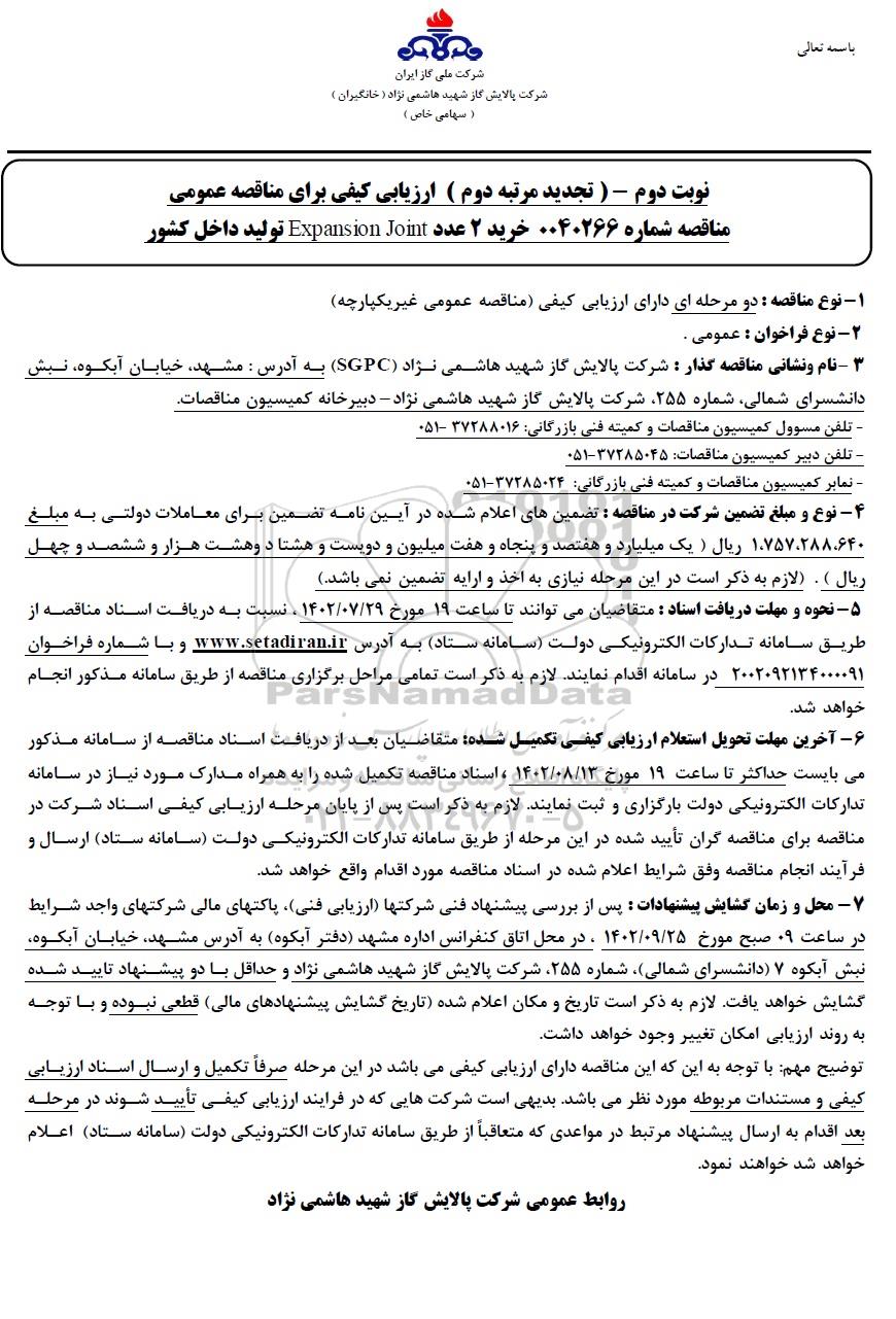 مناقصه شماره 0040266 خرید 2 عدد Expansion Joint تولید داخل کشور