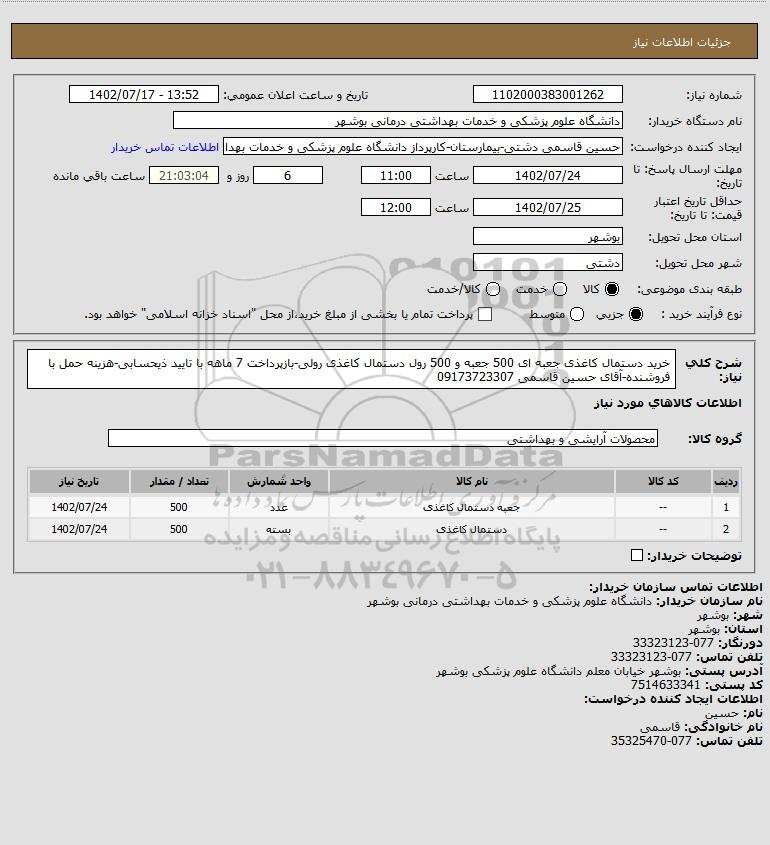 شرح کلی نیاز: خرید دستمال کاغذی جعبه ای 500 جعبه و 500 رول دستمال کاغذی رولی-بازپرداخت 7 ماهه با تایید ذیحسابی-هزینه حمل با فروشنده-آقای حسین قاسمی 09173723307