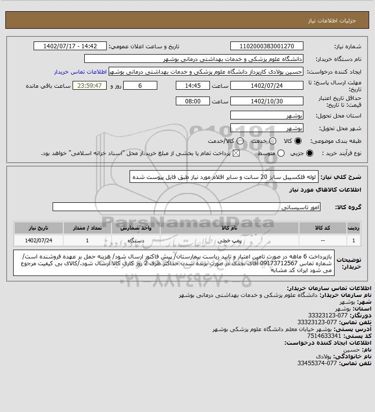 استعلام لوله فلکسیبل سایز 20 سانت و سایر اقلام مورد نیاز طبق فایل پیوست شده, استعلام لوله فلکسیبل سایز 20 سانت و سایر اقلام مورد نیاز طبق فایل پیوست شده