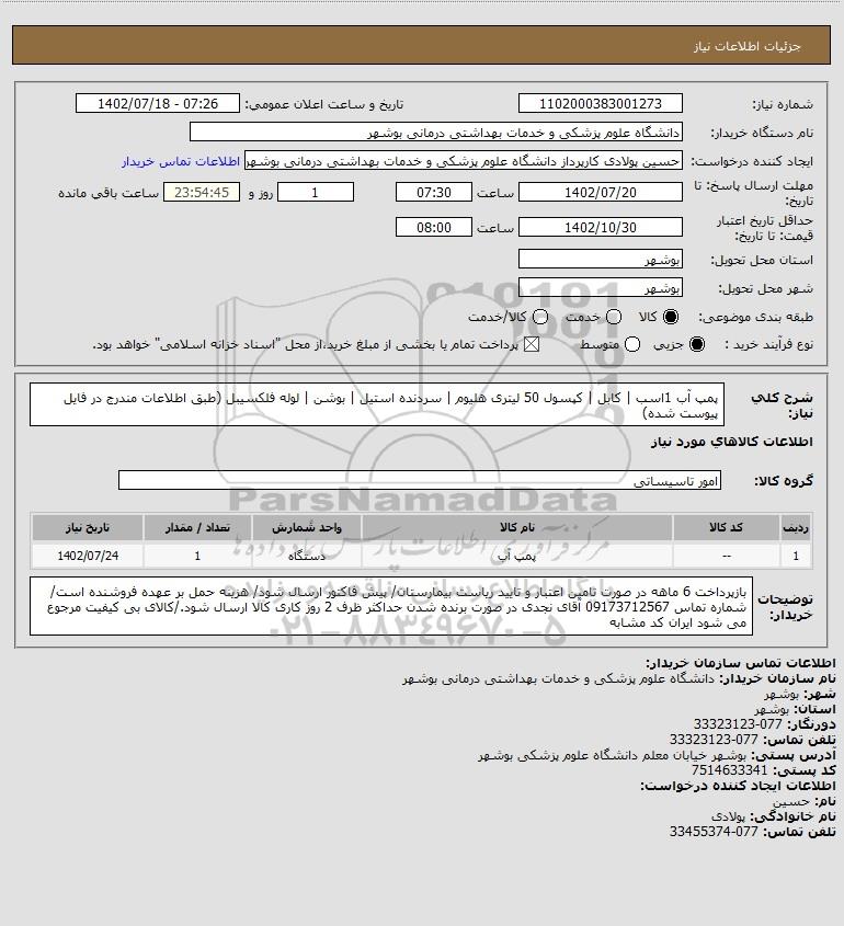 شرح کلی نیاز: پمپ آب 1اسب | کابل | کپسول 50 لیتری هلیوم | سردنده استیل | بوشن | لوله فلکسیبل (طبق اطلاعات مندرج در فایل پیوست شده)