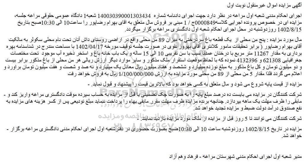 ،اجرای احکام مدنی شعبه اول مراغه در نظر دارد جهت اجرای دادنامه شماره 140030390001303434 شعبه1 دادگاه عمومی حقوقی مراغه جلسه مزایده ای در خصوص پرونده اجرایی کلاسه0000849ج / 1 مبنی بر فروش مال متعلق به اقای بهرام رضاپور را ساعت10 الی 10:30صبح بتاریخ 1402/8/15 روزدوشنبه در محل اجرای احکام شعبه اول دادگستری مراغه برگزار میگردد.