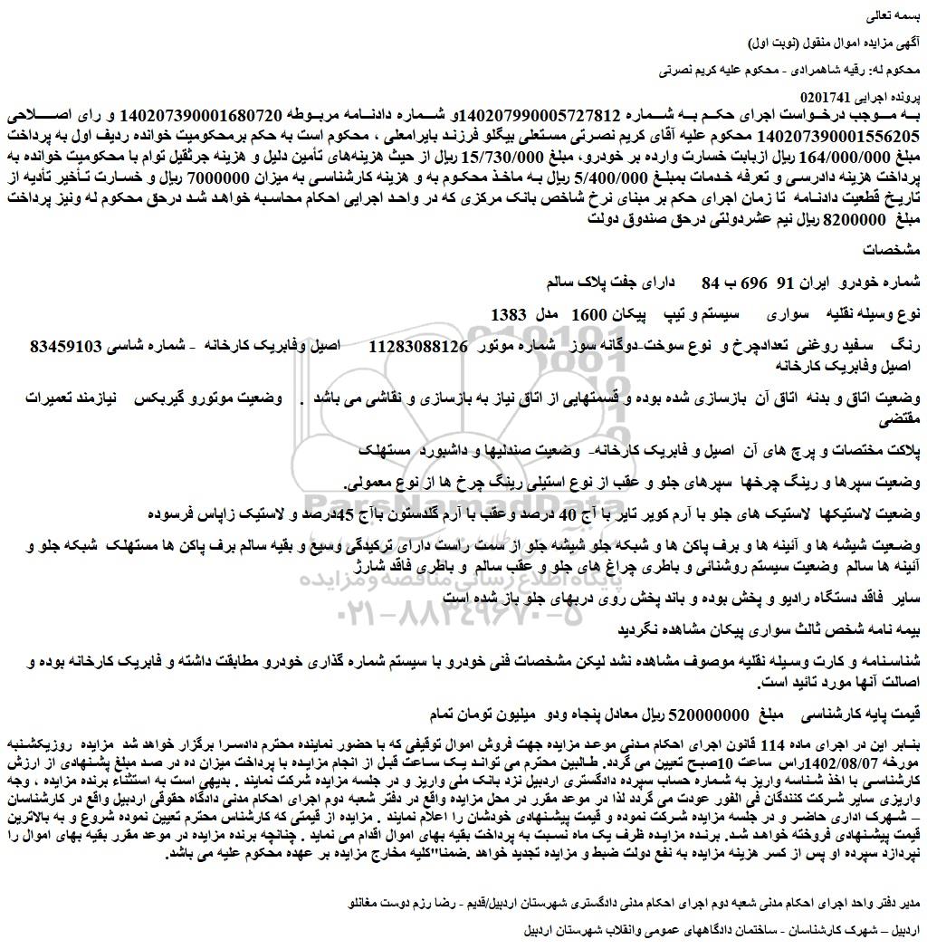 به موجب درخواست اجرای حکم به شماره 140207990005727812و شماره دادنامه مربوطه 140207390001680720 و رای اصلاحی 140207390001556205 محکوم علیه آقای کریم نصرتی مستعلی بیگلو فرزند بایرامعلی ، محکوم است به حکم برمحکومیت خوانده ردیف اول به پرداخت مبلغ 164/000/000 ریال ازبابت خسارت وارده بر خودرو، مبلغ 15/730/000 ریال از حیث هزینه های تأمین دلیل و هزینه جرثقیل توام با محکومیت خوانده به پرداخت هزینه دادرسی و تعرفه خدمات بمبلغ 5/400/000 ریال به ماخذ محکوم به و هزینه کارشناسی به میزان 7000000 ریال و خسارت تأخیر تأدیه از تاریخ قطعیت دادنامه تا زمان اجرای حکم بر مبنای نرخ شاخص بانک مرکزی که در واحد اجرایی احکام محاسبه خواهد شد درحق محکوم له ونیز پرداخت مبلغ 8200000 ریال نیم عشردولتی درحق صندوق دولت