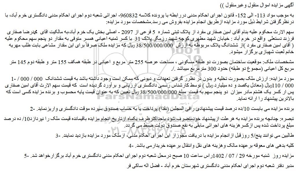 سهم الارث محکوم علیه بنام آقای امین صفاری مفرد از پلاک ثبتی شماره 5 فرعی از 2097 - اصلی بخش یک خرم آباد،به مالکیت اقای محمدرضا صفاری فرزند دستعلی واقع در خرم آباد : خیابان شهید مطهری کوچه شهید رزمگر پلاک 31 با کسر ثمنیه اعیانی همسر متوفی به مقدار دو پنجم سهم محکوم علیه ( آقای امین صفاری مفرد )از ششدانگ پلاک مربوطه به ارزش 38/500/000/000 ریال که مزایده ملک صرفاً برای این مقدار مشاعی بابت طلب مهریه خانم لعبت شهبازی برگزار میشود.