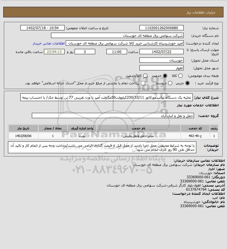شرح کلی نیاز: تخلیه یک دستگاه ترانسفورکاتور 230/33/11کیلوولت50مگاولت آمپر با وزن تقریبی 77 تن توسط جک/ با احتساب بیمه