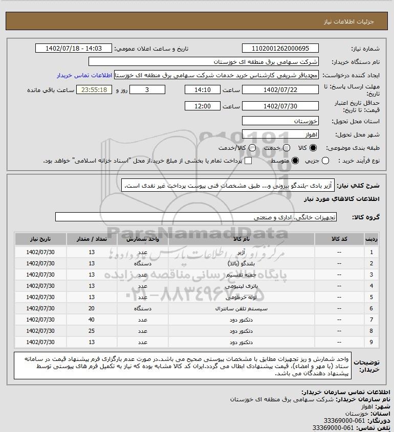شرح کلی نیاز: آژیر بادی -بلندگو بیرونی و... طبق مشخصات فنی پیوست پرداخت غیر نقدی است.