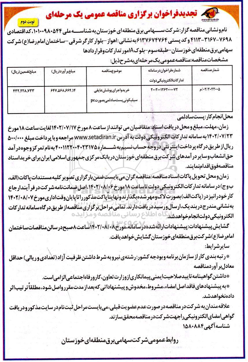 | 2022005/ 02/ م | 2002001262000072 | خرید و اجرای پوشش عایقی سیلیکونی پست سادلمی به صورت Pc | 647.568.664.14 | 432.228.733 |