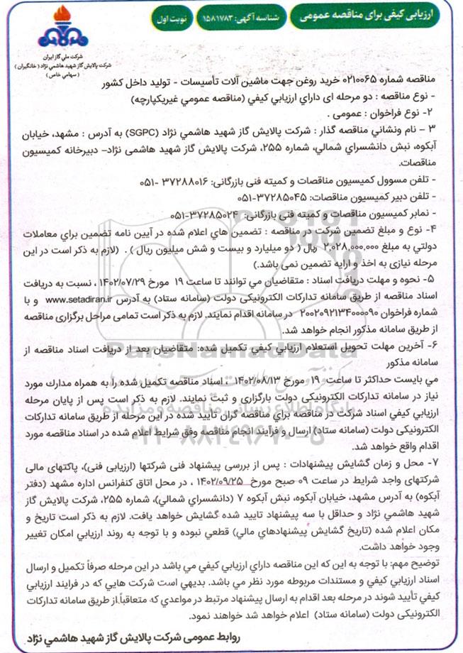 مناقصه شماره 0210065 خرید روغن جهت ماشین آلات تاسیسات - تولید داخل کشور