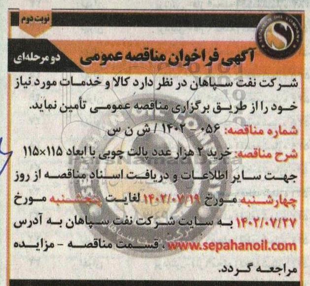 شرکت نفت سپاهان در نظر دارد کالا و خدمات مورد نیاز خود را از طریق برگزاری مناقصه عمومی تامین نماید.
