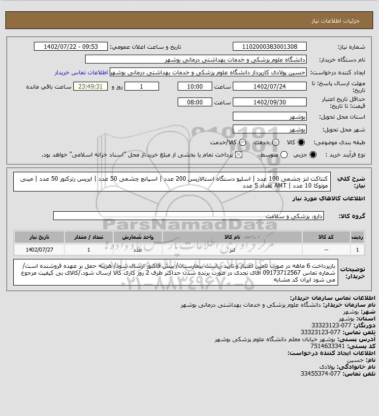 شرح کلی نیاز: کنتاکت لنز چشمی 100 عدد | اسلیو دستگاه استالاریس 200 عدد | اسپانچ چشمی 50 عدد | ایریس رترکتور 50 عدد | مینی مونوکا 10 عدد | AMT تعداد 5 عدد