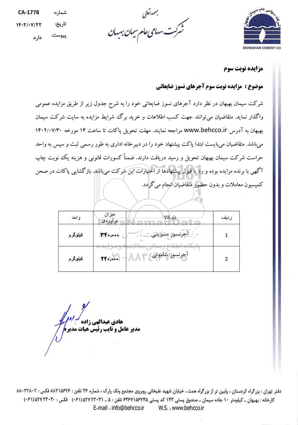 شرکت سیمان بهبهان در نظر دارد آجرهای نسوز ضایعاتی خود را به شرح جدول زیر از طریق مزایده عمومی واگذار نماید. متقاضیان می توانند جهت کسب اطلاعات و خرید برگ شرایط مزایده به سایت شرکت سیمان بهبهان به آدرس www.behcco.ir مراجعه نمایند.