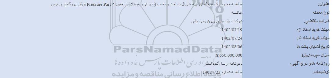 عنوان: مناقصه محدود یک مرحله ای تهیه متریال، ساخت و نصب (دمونتاژ و مونتاژ) و تعمیرات Pressure Part بویلر نیروگاه بندرعباس