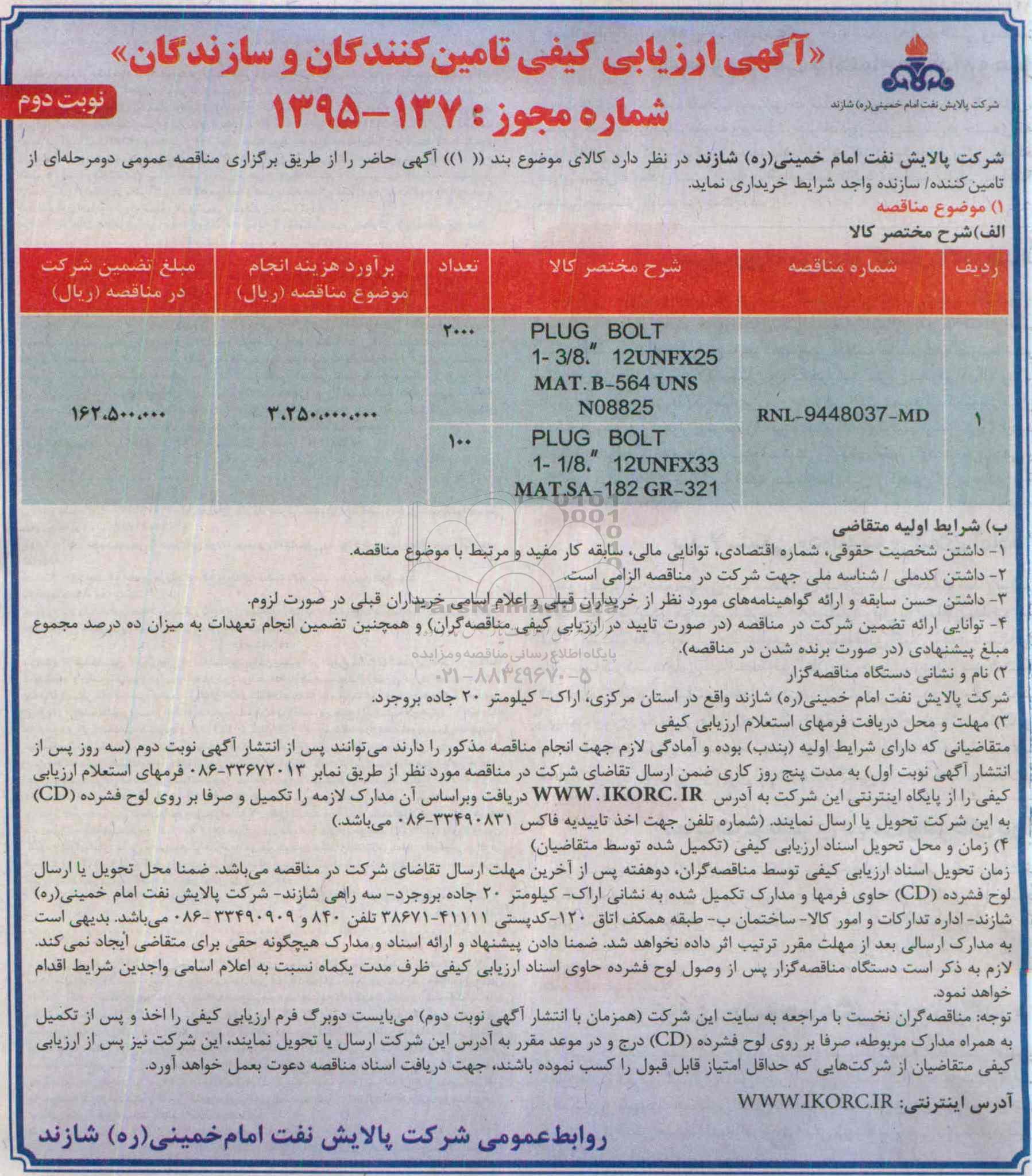 آگهی ارزیابی کیفی تامین کنندگان و سازندگان PLUG BOLT- نوبت دوم از کلیه افراد متخصص و شرکتها واجد شرایط دعوت به عمل میآید در مناقصه با کد خبرگزاری پارس نماد: 646880 شرکت نمایند.