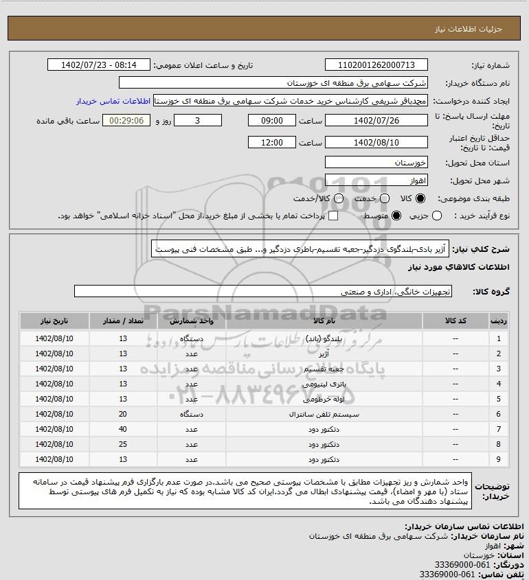 شرح کلی نیاز: آژیر بادی-بلندگوی دزدگیر-جعبه تقسیم-باطری دزدگیر و... طبق مشخصات فنی پیوست
