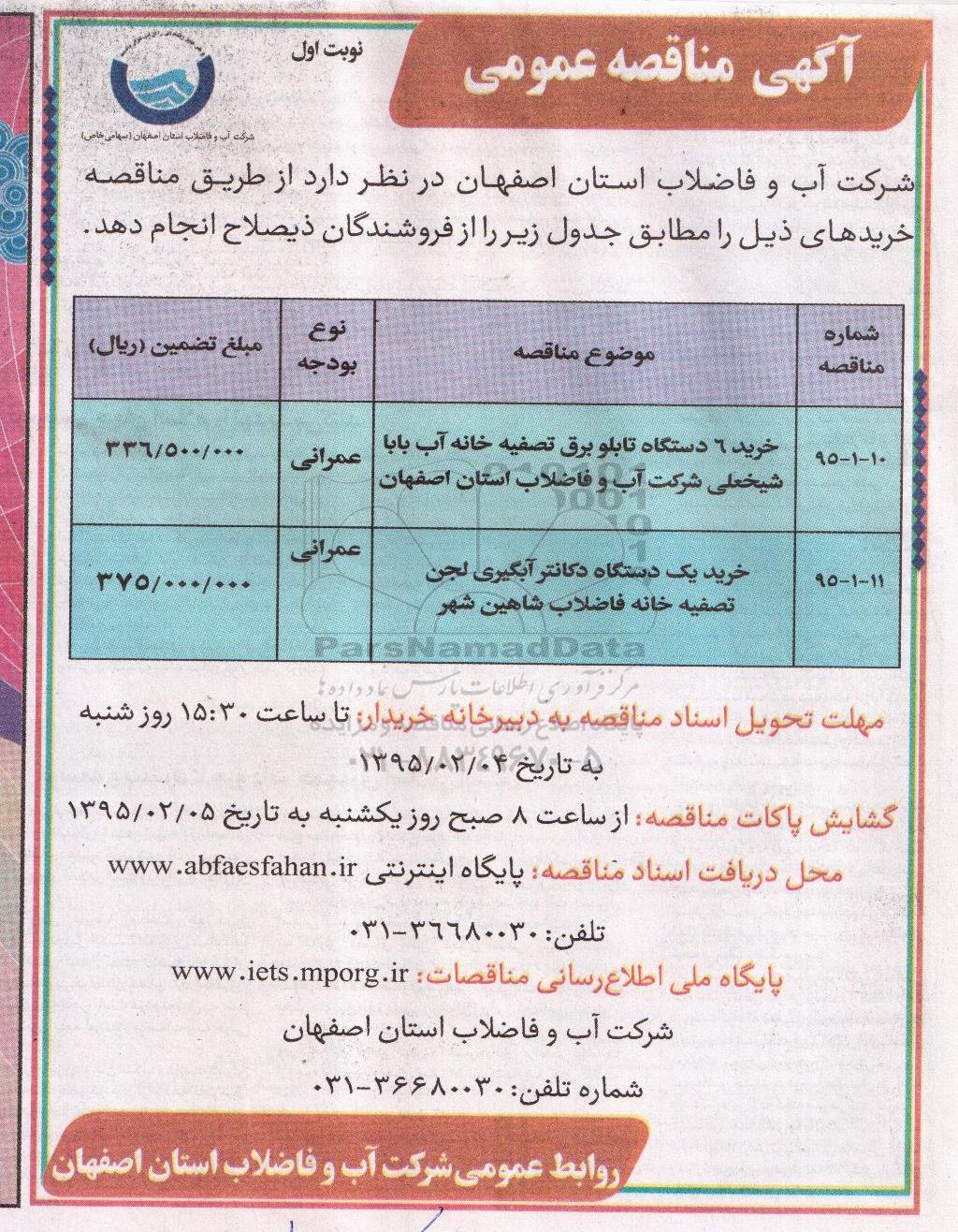شرکت آب و فاضلاب استان اصفهان در نظر دارد از طریق مناقصه خریدهای ذیل را مطابق جدول زیر را از فروشندگان ذیصلاح انجام دهد.