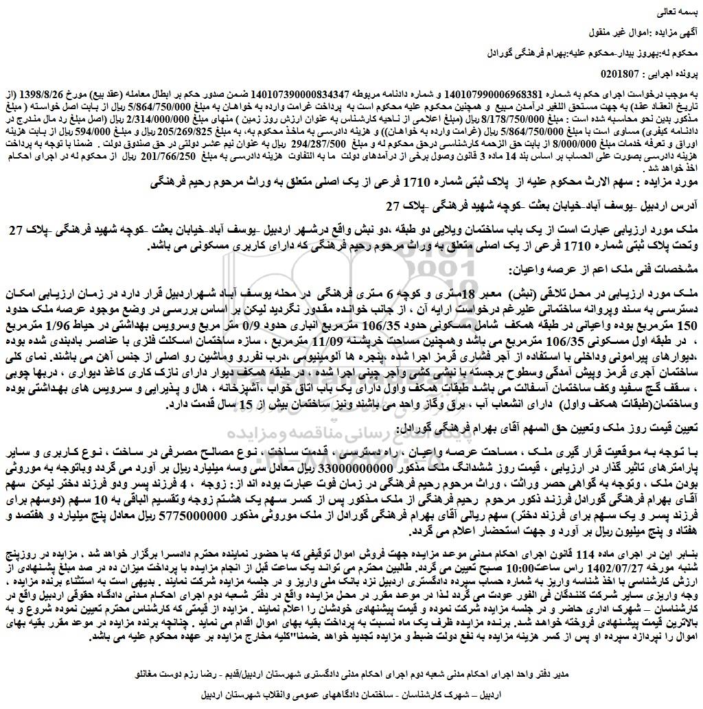مورد مزایده : سهم الارث محکوم علیه از پلاک ثبتی شماره 1710 فرعی از یک اصلی متعلق به وراث مرحوم رحیم فرهنگی
