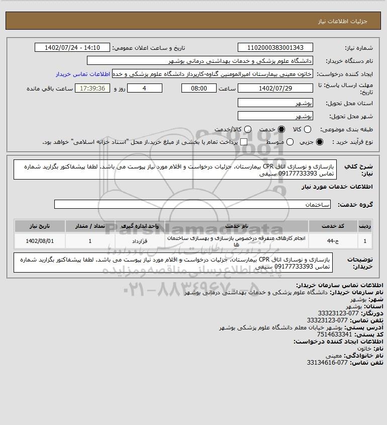 شرح کلی نیاز: بازسازی و نوسازی اتاق CPR بیمارستان. جزئیات درخواست و اقلام مورد نیاز پیوست می باشد. لطفا پیشفاکتور بگزارید شماره تماس 09177733393 سیفی