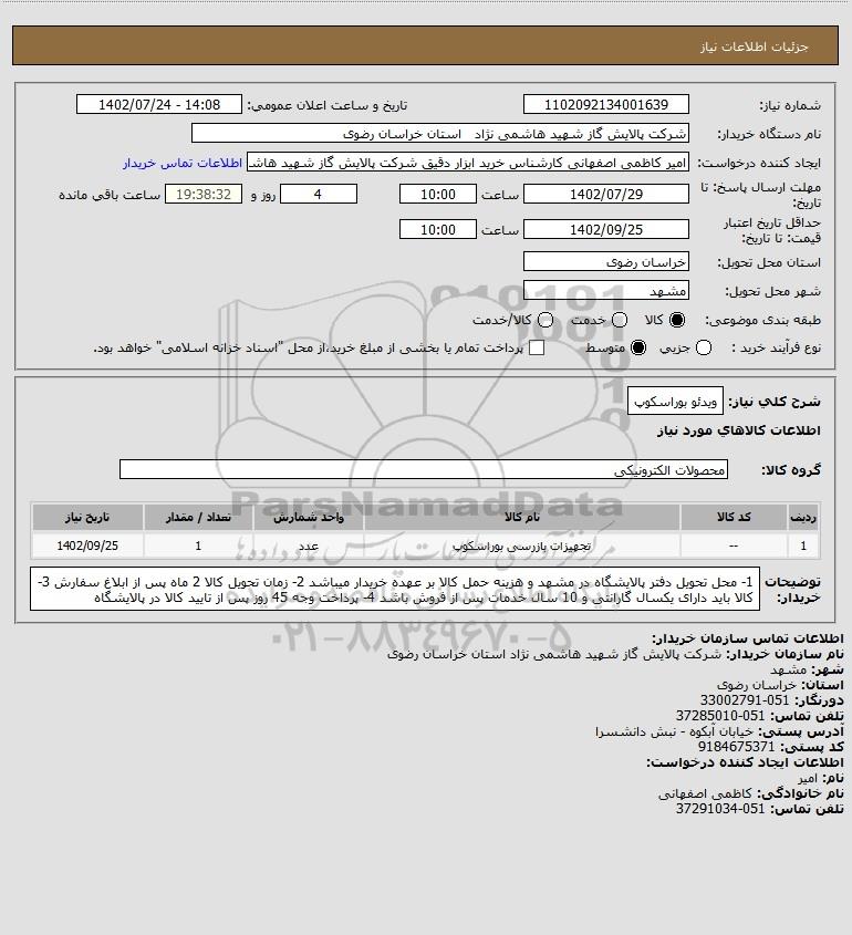 | 1 | -- | تجهیزات بازرسی بوراسکوپ | عدد | 1 | 1402/09/25 |