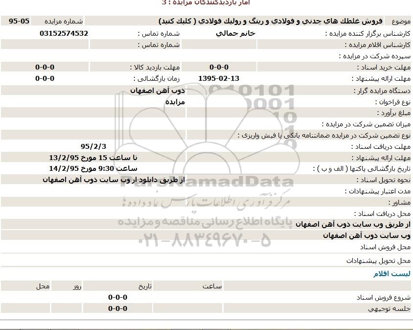 موضوع فروش غلطک های چدنی و فولادی و رینگ و رولیک فولادی  شماره مزایده   95-05
