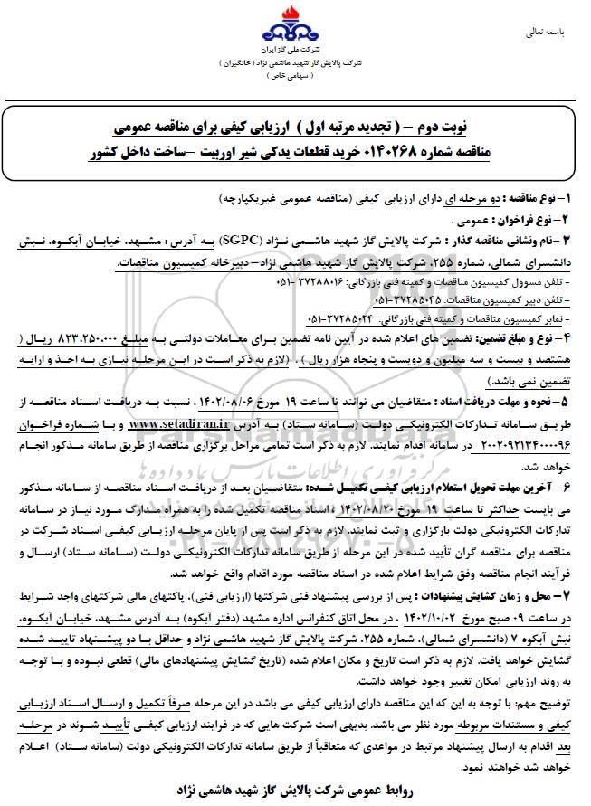 7- محل و زمان گشایش پیشنهادات: پس از بررسی پیشنهاد فنی شرکتها (ارزیابی فنی) پاکتهای مالی شرکتهای واجد شرایط در ساعت 9صبح مورخ 1402.10.2 در محل اتاق کنفرانس اداره مشهد آبکوه به آدرس مشهد خیابان آبکوه نبش آبکوه 7 دانشسرای شمال شماره 255 شرکت پالایش گاز شهید هاشمی نژاد و حداقل با دو پیشنهاد تایید شده گشایش خواهد یافت . لازم به ذکر است تاریخ و مکان اعلام شده تاریخ گشایش پیشنهادهای مالی قطعی نبوده و با توجه به روند ارزیابی امکان تغییر وجود خواهد داشت