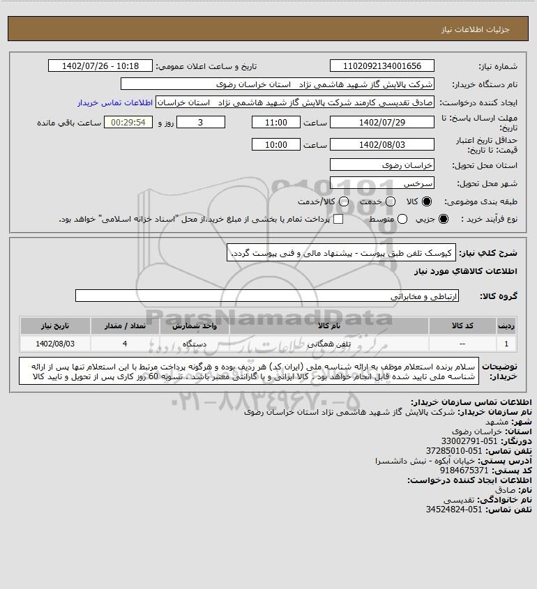نام دستگاه خریدار:شرکت پالایش گاز شهید هاشمی نژاد استان خراسان رضوی
