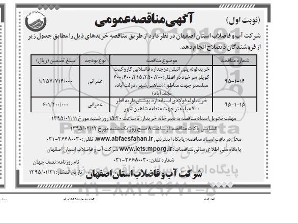 شرکت آب و فاضلاب استان اصفهان در نظر دارد از طریق مناقصه خریدهای ذیل را مطابق جدول زیر را از فروشندگان ذیصلاح انجام دهد.