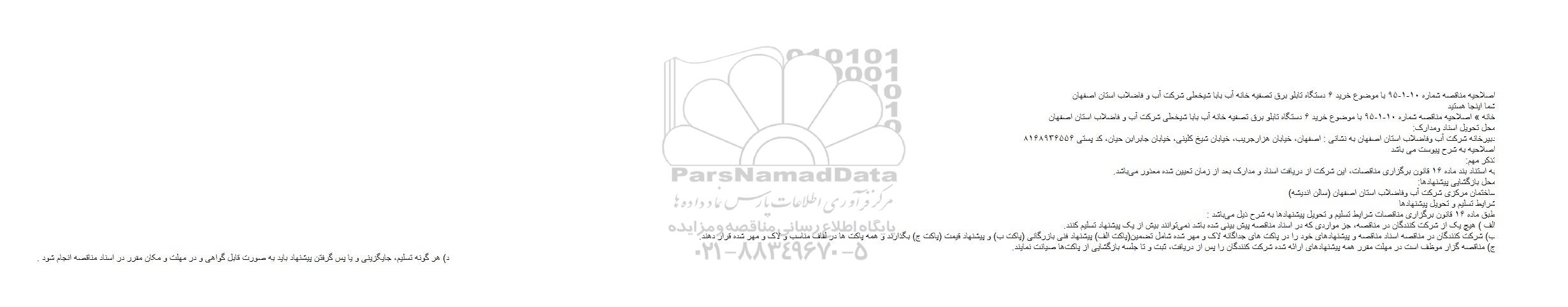 اصلاحیه مناقصه شماره 10-1-95 با موضوع خرید 6 دستگاه تابلو برق تصفیه خانه آب بابا شیخعلی شرکت آب و فاضلاب استان اصفهان