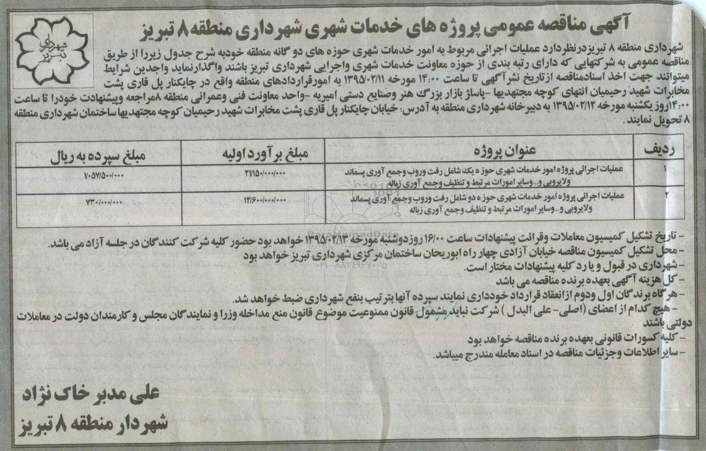 شهرداری منطقه 8 تبریز در نظر دارد عملیات اجرایی مربوط به امور خدمات شهری حوزه های دوگانه منطقه خود به شرح جدول زیر را از طریق مناقصه عمومی به شرکتهایی که دارای رتبه بندی از حوزه معاونت خدمات شهری و اجرایی شهرداری تبریز باشند واگذار نماید. واجدین شرایط می توانند جهت اخذ اسناد مناقصه از تاریخ نشر اگهی تا ساعت 14 مورخ 95.2.11 به امور قراردادهای منطقه واقع در چایکنار پل قاری پشت مخابرات شهید رحیمیان انتهای کوچه مجتهدیها - پاساژ بازار بزرگ هنر و صنایع دستی امیریه - واحد معاونت فنی و عمرانی منطقه 8 مراجعه و پیشنهادات خود را تا ساعت 14 روز یکشنبه مورخ 95.2.12 به دبیرخانه شهرداری منطقه به آدرس خیابان چایکنار پل قاری پشت مخابرات شهید رحیمیان کوچه مجتهدیها ساختمان شهرداری منطقه 8 تحویل نمایند
