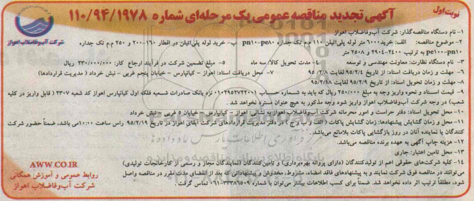 تجدید مناقصه خرید 6000 متر لوله پلی اتیلن 110 م.م تک جداره PN10-PE80 1 تجدید نوبت اول از کلیه افراد متخصص و شرکتها واجد شرایط دعوت به عمل میآید در مناقصه با کد خبرگزاری پارس نماد: 651455 شرکت نمایند.
