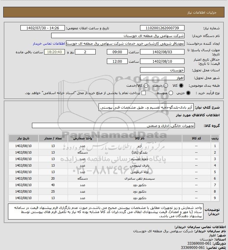 نام سازمان خریدار: شرکت سهامی برق منطقه ای خوزستان