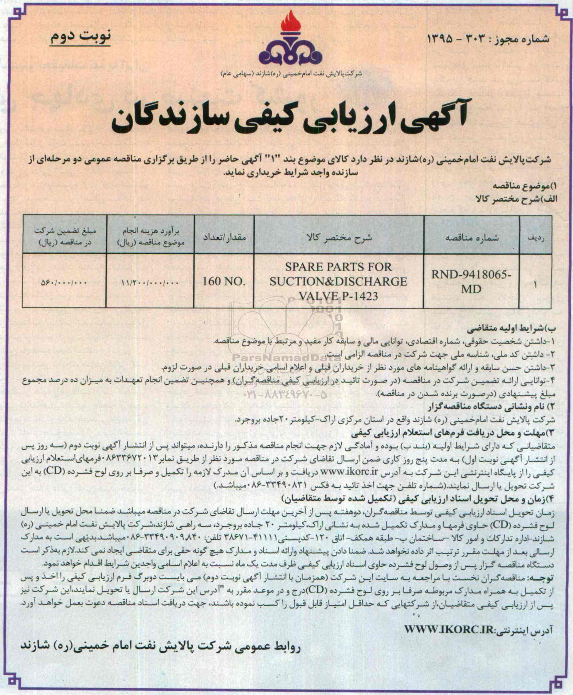 ارزیابی کیفی SPARE PARTS FOR SUCTION & DISCHAGE VALVE P-1423 نوبت دوم , آگهی ارزیابی کیفی سازندگان, مناقصه SPARE PARTS FOR SUCTION & DISCHAGE VALVE P-1423 نوبت دوم