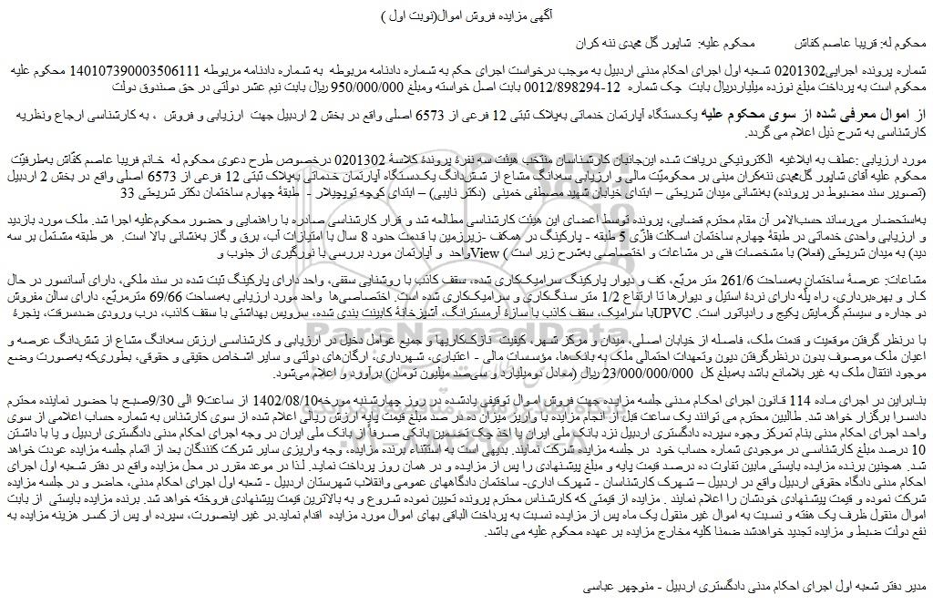 مورد ارزیابی :عطف به ابلاغیه الکترونیکی دریافت شده این جانبان کارشناسان منتخب هیئت سه نفرۀ پروندۀ کلاسۀ 0201302 درخصوص طرح دعوی محکوم له خانم فریبا عاصم کفّاش به طرفیّت محکوم علیه آقای شاپور گل محمدی ننه کران مبنی بر محکومیّت مالی و ارزیابی سه دانگ مشاع از شش دانگ یک دستگاه آپارتمان خدماتی به پلاک ثبتی 12 فرعی از 6573 اصلی واقع در بخش 2 اردبیل (تصویر سند مضبوط در پرونده) به نشانی میدان شریعتی – ابتدای خیابان شهید مصطفی خمینی (دکتر نایبی) – ابتدای کوچه توپچیلار - طبقۀ چهارم ساختمان دکتر شریعتی 33