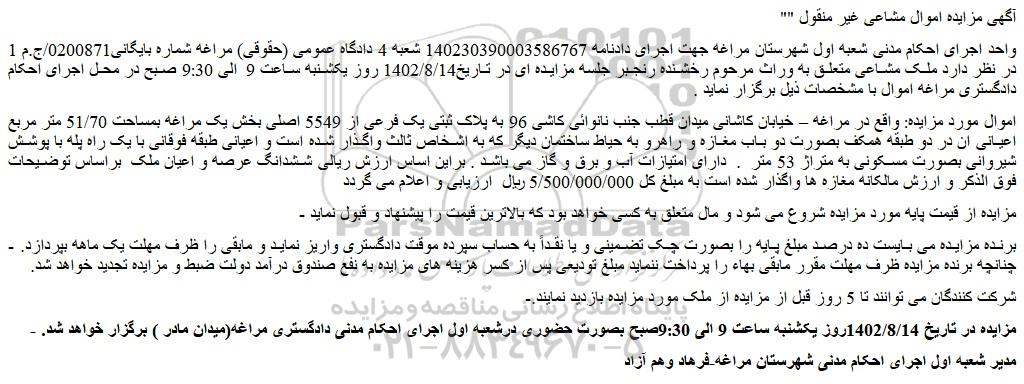 - مزایده در تاریخ 1402/8/14روز یکشنبه ساعت 9 الی 9:30صبح بصورت حضوری درشعبه اول اجرای احکام مدنی دادگستری مراغه(میدان مادر ) برگزار خواهد شد.