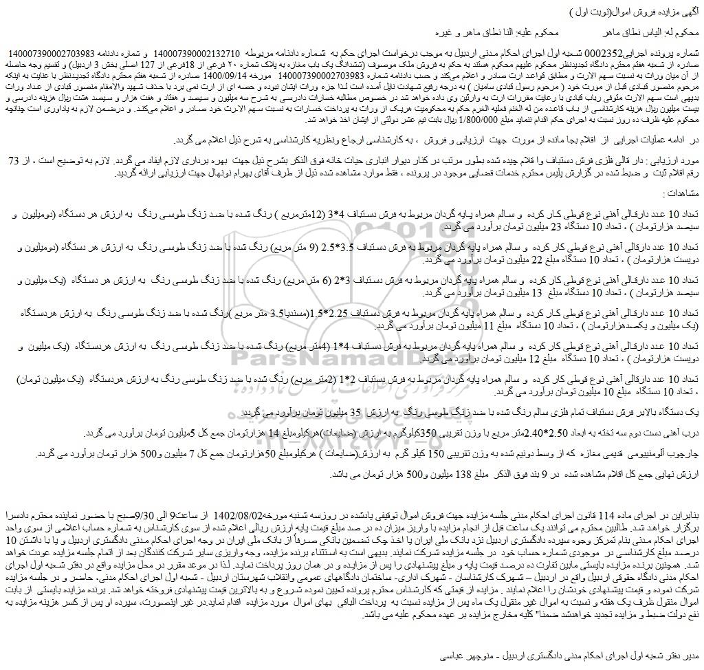 شماره پرونده اجرایی0002352 شعبه اول اجرای احکام مدنی اردبیل به موجب درخواست اجرای حکم به شماره دادنامه مربوطه 140007390002132710 و شماره دادنامه 140007390002703983 صادره از شعبه هفتم محترم دادگاه تجدیدنظر محکوم علیهم محکوم هستند به حکم به فروش ملک موصوف (ششدانگ یک باب مغازه به پلاک شماره ۲۰ فرعی از 18فرعی از 127 اصلی بخش 3 اردبیل) و تقسیم وجه حاصله از آن میان وراث به نسبت سهم الارث و مطابق قواعد ارث صادر و اعلام می کند و حسب دادنامه شماره 140007390002703983 مورخه 1400/09/14 صادره از شعبه هفتم محترم دادگاه تجدیدنظر با عنایت به اینکه مرحوم منصور قبادی قبل از مورث خود ( مرحوم رسول قبادی سامیان ) به درجه رفیع شهادت نایل آمده است لذا جزء وراث ایشان نبوده و حصه ای از ارث نمی برد با حذف شهید والامقام منصور قبادی از عداد وراث بدیهی است سهم الارث متوفی رباب قبادی با رعایت مقررات ارث به وارثین وی داده خواهد شد در خصوص مطالبه خسارات دادرسی به شرح سه میلیون و سیصد و هفتاد و هفت هزار و سیصد هشت ریال هزینه دادرسی و بیست میلیون ریال هزینه کارشناسی از باب قاعده من له الغنم فعلیه الغرم حکم به محکومیت هریک از وراث به پرداخت خسارات به نسبت سهم الارث خود صادر و اعلام می کند. و درضمن لازم به یاداوری است چنانچه محکوم علیه ظرف ده روز نسبت به اجرای حکم اقدام ننماید مبلغ 1/800/000 ریال بابت نیم عشر دولتی از ایشان اخذ خواهد شد.