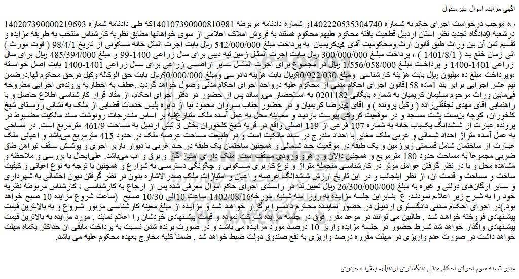 به موجب درخواست اجرای حکم به شماره 1402220535304740و شماره دادنامه مربوطه 140107390000810981که طی دادنامه شماره 140207390000219693 درشعبه 9دادگاه تجدید نظر استان اردبیل قطعیت یافته محکوم علیهم محکوم هستند به فروش املاک اعلامی از سوی خواهانها مطابق نظریه کارشناس منتخب به طریقه مزایده و تقسیم ثمن آن بین وراث طبق قانون ارث.ومحکومیت آقای محمدکریمیان به پرداخت مبلغ 542/000/000 ریال بابت اجرت المثل خانه مسکونی از تاریخ 98/4/1 ( فوت مورث ) الی زمان خلع ید ( 1401/8/1 ) ، پرداخت مبلغ 300/000/000 ریال بابت اجرت المثل زمین تپه دیبی برای سال زراعی 1400-99 و مبلغ 485/394/000 ریال برای سال زراعی 1401-1400 و پرداخت مبلغ 1/556/058/000 ریال در مجموع برای اجرت المثل سایر اراضی زراعی برای سال زراعی 1401-1400 بابت اصل خواسته ،وپرداخت مبلغ ده میلیون ریال بابت هزینه کارشناسی ومبلغ 80/922/030ریال بابت هزینه دادرسی ومبلغ 50/000/000ریال بابت حق الوکاله وکیل درحق محکوم لها.درضمن نیم عشر اجرایی برابر بند 1ماده 158قانون اجرای احکام مدنی از محکوم علیه درواحد اجرای احکام مدنی وصول خواهد گردید..عطف به اخطاریه پرونده ی اجرایی مطروحه فی مابین وراث مرحوم سلیمان کریمیان به شماره بایگانی 0201182 به استحضار می رساند پس از حضور در دفتر اجرای احکام، از مفاد قرار کارشناسی اطلاع حاصل و با راهنمایی آقای مهدی نجفقلی زاده ( وکیل پرونده ) و آقای محمد رضا کریمیان و در حضور جناب سروان محمود نیا از دایره پلیس خدمات قضایی از ملک به نشانی روستای شیخ کلخوران، کوچه بن بست پشت مسجد و در موقعیت کروکی پیوست بازدید و معاینه محل به عمل آمده ملک متنازع فیه بر اساس مندرجات رونوشت سند مالکیت مضبوط در پرونده عبارت از ششدانگ یک باب خانه به شماره 107 فرعی از 119 اصلی واقع در قریه شیخ کلخوران بخش 3 ثبتی اردبیل به مساحت 461/9 مترمربع است. در مساحی به عمل آمده متراژ احداد شمالی و غربی ملک مغایر با احداد مندرج در سند مالکیت است و در طبیعت مساحت عرصه ملک در حدود 415 مترمربع می باشد و اعیانی ملک عبارت از ساختمان شامل قسمتی زیرزمین و یک طبقه در موقعیت حد شمالی و همچنین ساختمان یک طبقه در حد غربی با دیوار باربر آجری و پوشش سقف تیرآهن طاق ضربی مجموعاَ به مساحت حدود 180 مترمربع و همچنین دالان و راهرو ورودی مسقف است. ملک دارای امتیاز گاز و برق و آب می باشد. علی ایحال با بررسی و ملاحظه و مشاهده محل و با در نظر گرفتن عوامل موثر در کارشناسی منجمله متراژ و نوع کاربری مسکونی و چگونگی دسترسی به شوارع و همچنین با توجه به نوع اعیانی و کیفیت ساخت و مساحت و قدمت آن، از نظر اینجانب و در این تاریخ ارزش ششدانگ عرصه و اعیان و امتیازات ملک صدرالاشاره بدون در نظر گرفتن دیون احتمالی به شهرداری و سایر ارگان های دولتی و غیره به مبلغ 26/300/000/000 ریال تعیین.لذا در راستای اجرای حکم اموال معرفی شده پس از ارجاع به کارشناسی ، کارشناس مربوطه نظریه خود را به شرح زیر اعلام نمودند: ع بنابراین جلسه مزایده به روز سه شنبه مورخه1402/08/16 ساعت 10الی 10/30 صبح (ساعت شروع مزایده 10 صبح خواهد بود.)در اجرای احکام مدنی دادگستری اردبیل در حضور نماینده محترم دادسرا برگزار خواهد شد و مزایده از مبلغ معینه کارشناسی مزبور شروع و به بالاترین قیمت پیشنهادی فروخته خواهد شد . طالبین می توانند در موعد مقرر فوق در جلسه مزایده شرکت نموده و قیمت پیشنهادی خودشان را اعلام نمایند . مورد مزایده به بالاترین قیمت پیشنهادی واگذار خواهد شد شرط حضور در جلسه مزایده واریز 10 درصد مورد مزایده می باشد و در صورت برنده شدن نسبت به پرداخت مابقی آن حداکثر یکماه مهلت خواهد داشت در صورت عدم واریزی در مهلت مقرره درصد واریزی به نفع صندوق دولت ضبط خواهد شد . ضمناً کلیه مخارج بعهده محکوم علیه می باشد.
