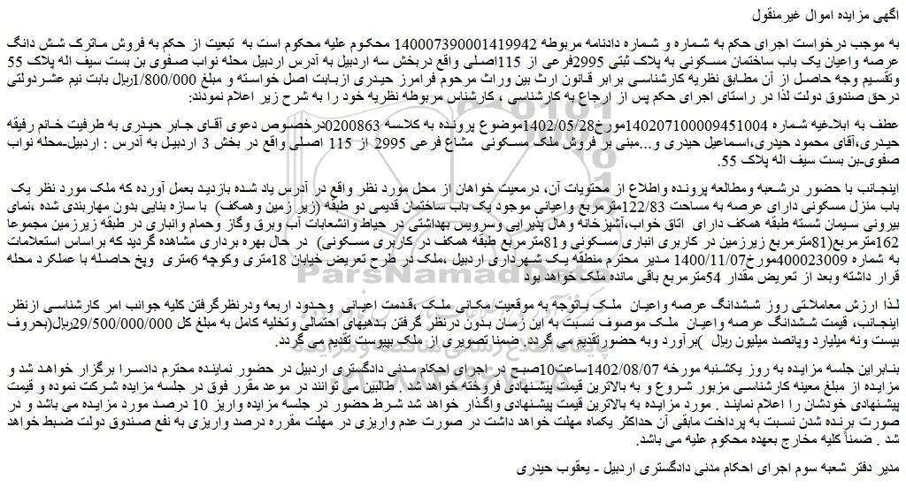 به موجب درخواست اجرای حکم به شماره و شماره دادنامه مربوطه 140007390001419942 محکوم علیه محکوم است به تبعیت از حکم به فروش ماترک شش دانگ عرصه واعیان یک باب ساختمان مسکونی به پلاک ثبتی 2995فرعی از 115اصلی واقع دربخش سه اردبیل به آدرس اردبیل محله نواب صفوی بن بست سیف اله پلاک 55 وتقسیم وجه حاصل از آن مطابق نظریه کارشناسی برابر قانون ارث بین وراث مرحوم فرامرز حیدری ازبابت اصل خواسته و مبلغ 1/800/000ریال بابت نیم عشردولتی درحق صندوق دولت لذا در راستای اجرای حکم پس از ارجاع به کارشناسی ، کارشناس مربوطه نظریه خود را به شرح زیر اعلام نمودند: