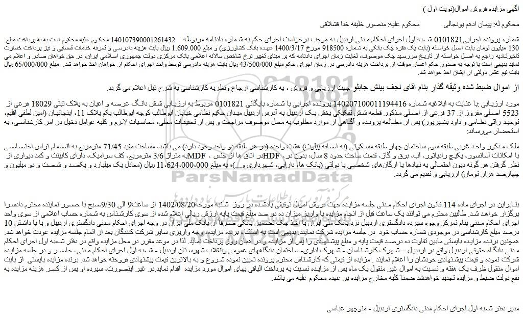شعبه صادر کننده:شعبه اول اجرای احکام مدنی دادگستری شهرستان اردبیل/قدیم