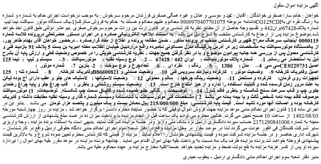 خواهان : خانم سارا صفری خواندگان : آقایان : محمد و موسی و عادل و غیره همگی صفری فرزندان مرحوم سرخوش : به موجب درخواست اجرای حکم به شماره و شماره دادنامه مربوطه 9909970407701075 محکوم علیهم محکوم هستند به حکم به فروش ماترک(1-یک دستگاه موتور سیکلت نیما تیپ CG125CDIبه رنگ نقره ای به شماره پلاک67428ایران442 و تقسیم وجه حاصل از آن مطابق نظریه کارشناسی برابر قانون ارث بین وراث مرحوم سرخوش صفری .نیم عشر دولتی طبق قانون اخذ خواهد شد.موضوع مزایده پس از ارجاع به کارشناس منتخب به شرح ذیل می باشد : به استناد ابلاغیه الکترونیکی صادره و در اجرای دستور حضرتعالی درپرونده کلاسه شماره 0000115 اینجانب سرهنگ معراج ظهیری کارشناس منتخب در پرونده مذکور ، ضمن مطالعه پرونده و اطلاع از مفاد قرارصادره ، درحضور خواهان آقای بهنام طاهر پور، از یکدستگاه موتورسیکلت به مشخصات زیر در آدرس پارگینگ منزل مسکونی نامبرده واقع دراردبیل خیابان انقلاب محله امیریه بن بست 5 پلاک 91 بازدید فنی و کارشناسی معمول پس از بررسی همه جانبه پیرامون موضوع و با در نظر گرفتن جمیع جهات ، نظریه کارشناسی خویش را در خصوص وضعیت فعلی و ارزش پایه آن بشرح ذیل به استحضار می رسانم. 1- شماره پلاک موتورسیکلت : ایران 442 / 67428 -- 2- نوع وسیله نقلیه : موتورسیکلت - 3-- سیستم و تیپ : نیما 125 سی سی 4-- مدل : 1386 5- رنگ : نقره ای - 6- تعدادچرخ و نوع سوخت : 2- بنزین 7- شماره موتور : CE0229731 اصیل وفابریک کارخانه. 8 - شماره تنه : 125B86600821 اصیل وفابریک کارخانه 9- وضعیت موتور : کارکرده ونیازمند سرویس فنی 10- وضعیت صندلی و تجهیزات روی فرمان: کارکرده و مستعمل 11- وضعیت رینگ چرخها : سالم و معمولی 12 - وضعیت لاستیکها : لاستیک های جلو و عقب دارای آج بوده لیکن به علت مرور زمان فرسده شده و قابلیت استفاده را ندارد و از حیز انتفاع خارج است. 13- وضعیت سیستم روشنائی و باطری : قاب چراغ جلو و پایه چراغ رهنمای جلوی چپ و قاب سرعت سنج شکسته و باطری فاقد شارژ 14- توضیحات : گلگیر جلو خمیده شده و قالپاق سمت چپ شکسته. توضیحات: 1) موتورسیکلت موصوف فاقد بیمه نامه شخص ثالث و یا بیمه بدنه می باشد 2 ) مشخصات فنی موتورسیکلت با شناسنامه وسیستم شماره گذاری وسیله نقلیه مطابقت داشته و فابریک کارخانه بوده و اصالت آنها مورد تائید است. قیمت پایه کارشناسی: مبلغ 215/000/000 ریال معادل بیست و یک میلیون و پانصد هزار تومان می باشد . .بنابر این در اجرای ماده 114 قانون اجرای احکام مدنی موعد مزایده جهت فروش اموال توقیفی که با حضور نماینده محترم دادسرا برگزار خواهد شد ، مزایده در روز چهارشنبه مورخه 1402/08/03 از ساعت 10 صبح تعیین می گردد. طالبین محترم می تواند یک ساعت قبل از انجام مزایده با پرداخت میزان ده در صد مبلغ پشنهادی از ارزش کارشناسی معینه به شماره 2171290841006 حساب سپرده دادگستری اردبیل نزد بانک ملی واریز ودر جلسه مزایده شرکت نمایند .بدیهی است به استثناء برنده مزایده ، وجه واریزی سایر شرکت کنندگان فی الفور عودت می گردد لذا در موعد مقرر در محل مزایده واقع در دفتر شعبه سوم اجرای احکام مدنی دادگاه حقوقی اردبیل واقع در کارشناسان – شهرک اداری حاضر و در جلسه مزایده شرکت نموده و قیمت پیشنهادی خودشان را اعلام نمایند . مزایده از قیمتی که کارشناس محترم تعیین نموده شروع و به بالاترین قیمت پیشنهادی فروخته خواهد شد.برنده مزایده ظرف یک ماه نسبت به پرداخت بقیه بهای اموال اقدام می نماید . چنانچه برنده مزایده در موعد مقرر بقیه بهای اموال را نپردازد سپرده او پس از کسر هزینه مزایده به نفع دولت ضبط و مزایده تجدید خواهد .ضمنا"کلیه مخارج مزایده بر عهده محکوم علیه می باشد.