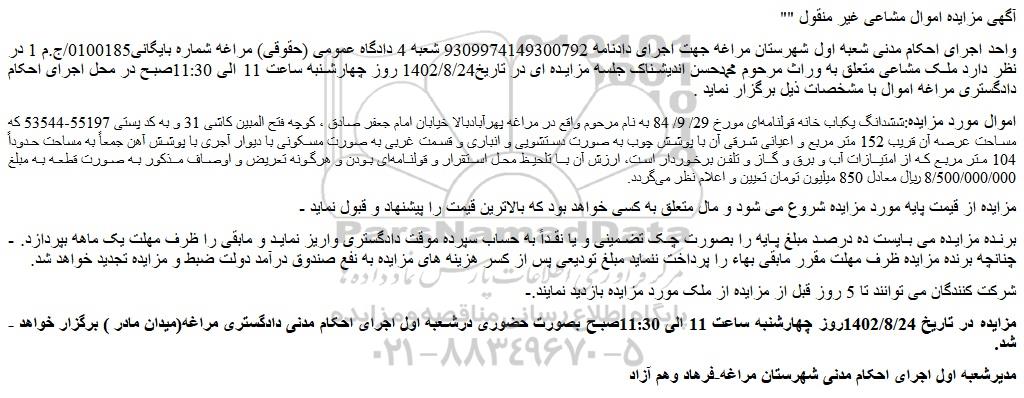 "آگهی مزایده اموال مشاعی غیر منقول "