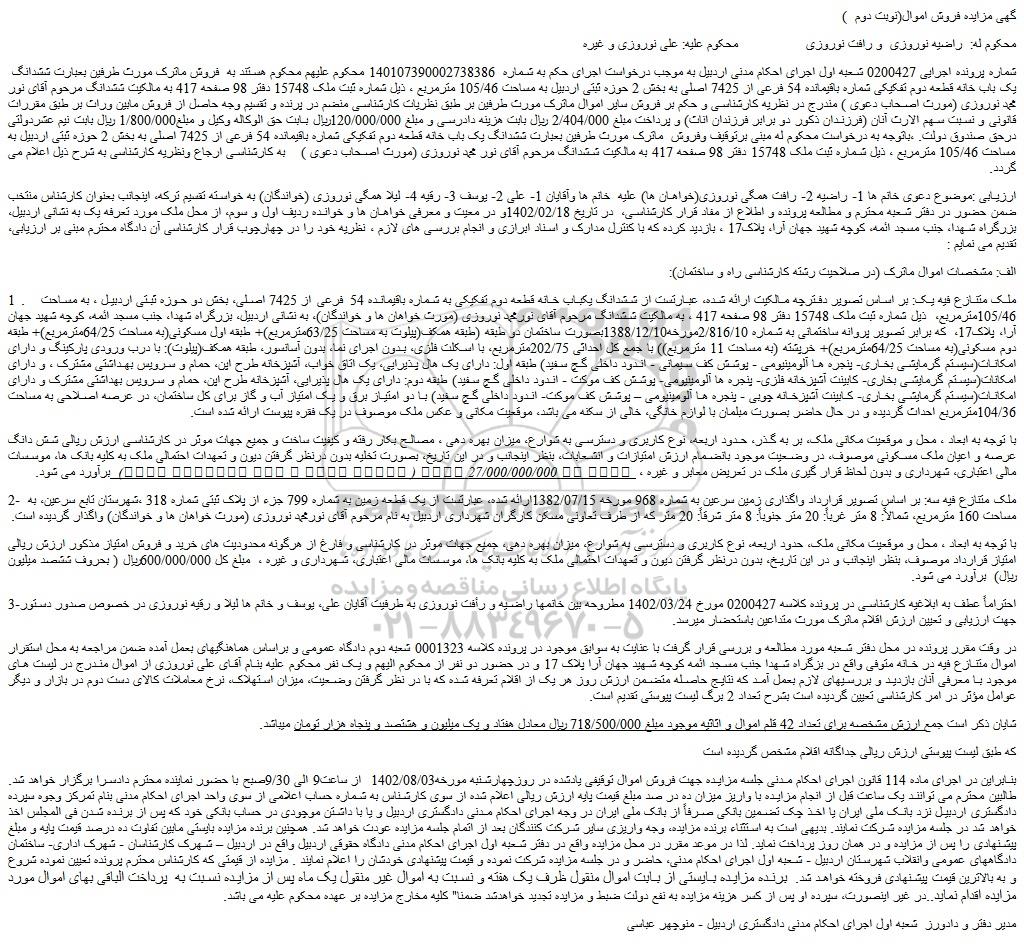 شماره پرونده اجرایی 0200427 شعبه اول اجرای احکام مدنی اردبیل به موجب درخواست اجرای حکم به شماره 140107390002738386 محکوم علیهم محکوم هستند به فروش ماترک مورث طرفین بعبارت ششدانگ یک باب خانه قطعه دوم تفکیکی شماره باقیمانده 54 فرعی از 7425 اصلی به بخش 2 حوزه ثبتی اردبیل به مساحت 105/46 مترمربع ، ذیل شماره ثبت ملک 15748 دفتر 98 صفحه 417 به مالکیت ششدانگ مرحوم آقای نور محمد نوروزی (مورث اصحاب دعوی ) مندرج در نظریه کارشناسی و حکم بر فروش سایر اموال ماترک مورث طرفین بر طبق نظریات کارشناسی منضم در پرنده و تقسیم وجه حاصل از فروش مابین وراث بر طبق مقررات قانونی و نسبت سهم الارث آنان (فرزندان ذکور دو برابر فرزندان اناث) و پرداخت مبلغ 2/404/000 ریال بابت هزینه دادرسی و مبلغ 120/000/000ریال بابت حق الوکاله وکیل و مبلغ1/800/000 ریال بابت نیم عشردولتی درحق صندوق دولت. ،باتوجه به درخواست محکوم له مبنی برتوقیف وفروش ماترک مورث طرفین بعبارت ششدانگ یک باب خانه قطعه دوم تفکیکی شماره باقیمانده 54 فرعی از 7425 اصلی به بخش 2 حوزه ثبتی اردبیل به مساحت 105/46 مترمربع ، ذیل شماره ثبت ملک 15748 دفتر 98 صفحه 417 به مالکیت ششدانگ مرحوم آقای نور محمد نوروزی (مورث اصحاب دعوی ) به کارشناسی ارجاع ونظریه کارشناسی به شرح ذیل اعلام می گردد.